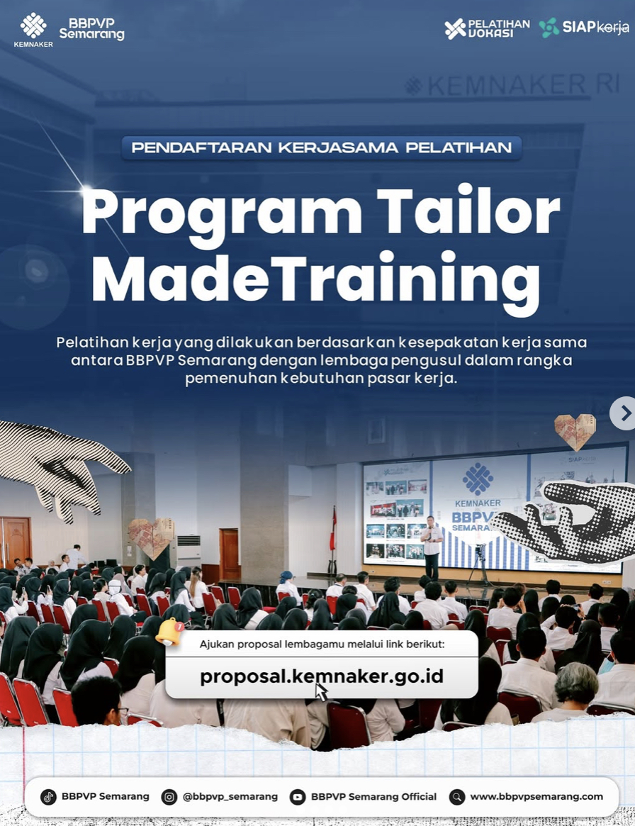 Tailor Made Training (TMT) adalah program pelatihan yang dirancang khusus menyesuaikan kebutuhan spesifik industri. Bukan pelatihan biasa, tapi pelatihan hasil kolaborasi langsung antara BBPVP Semarang dengan lembaga pengusul. Materi pelatihan bisa disesuaikan dengan kebutuhan, sehingga hasilnya menjadi lebih tepat sasaran!