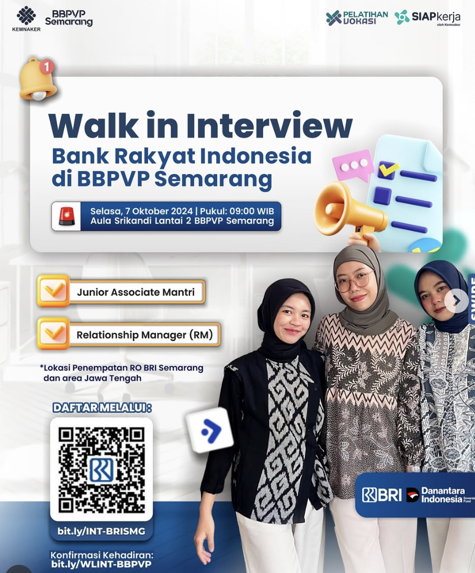 Semarang – BBPVP Semarang bekerjasama dengan PT BRI membuka pendaftaran Wawancara Kerja Langsung (Walk in Interview)